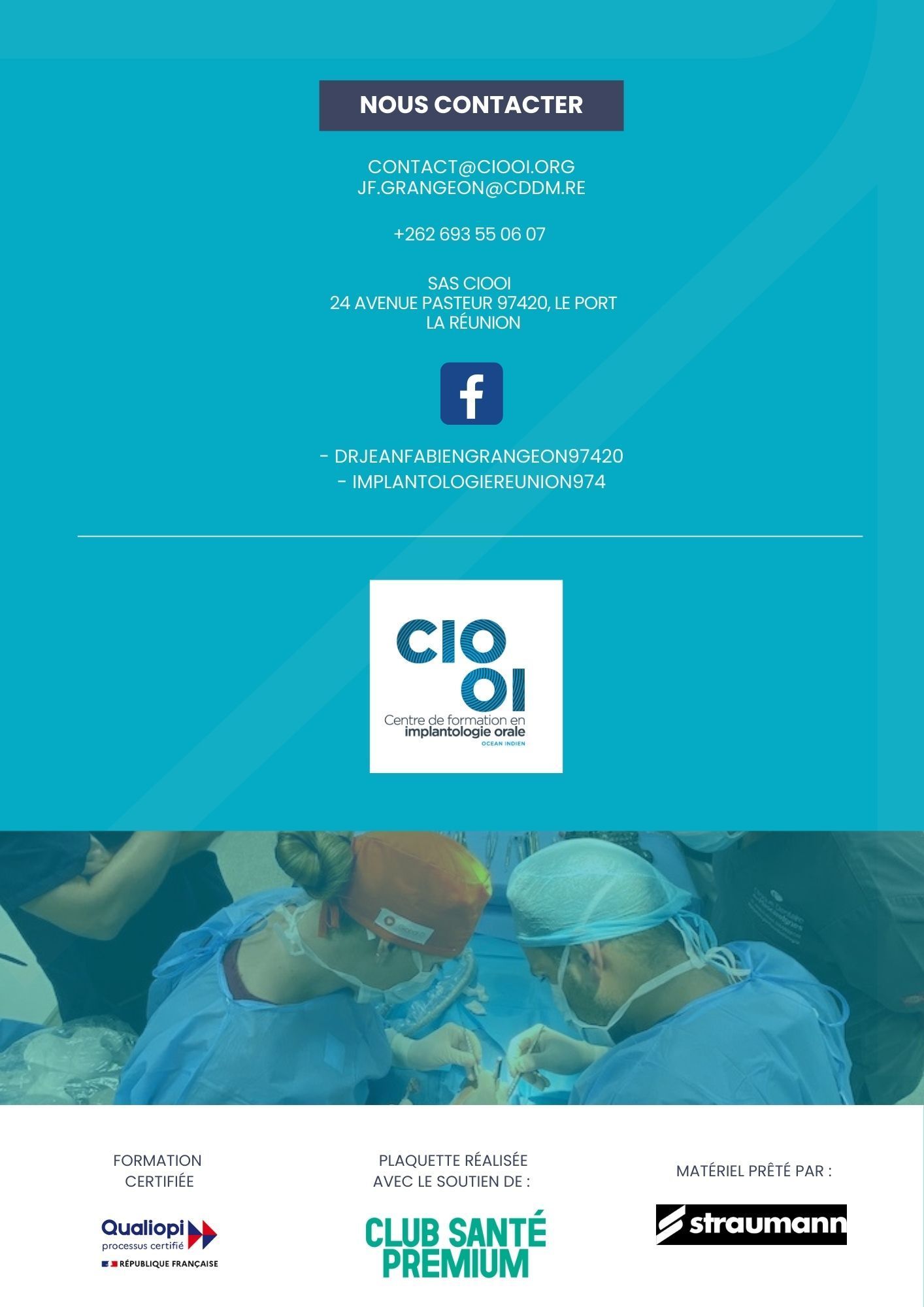 Au Centre de Formation en Implantologie Orale de l'Océan Indien (CIOOI) situé au Port à La Réunion, nous assurons la formation des chirurgiens-dentistes en implantologie orale dans un cadre professionnel. Nos atouts : l’apprentissage de la pose d’implants sur de vrais patients en travaux dirigés et en toute sécurité grâce à nos formateurs-praticiens.